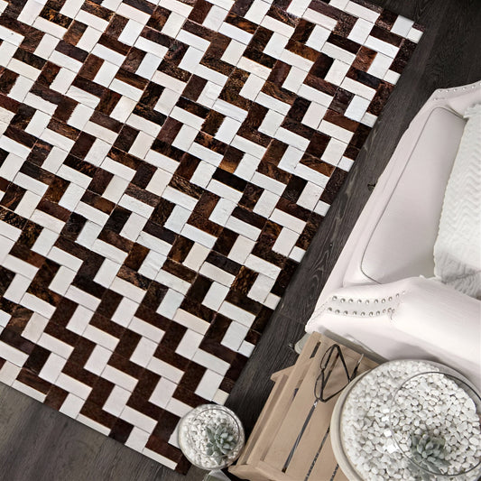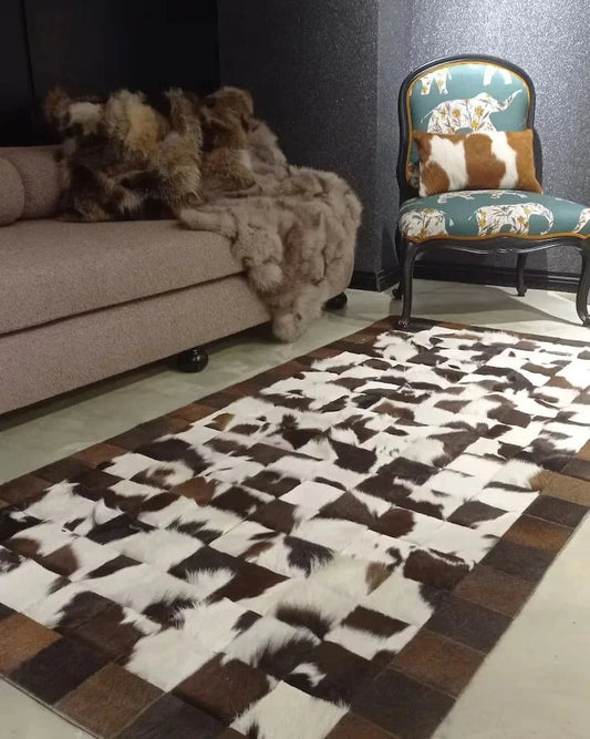 Brown and Black Cow Skin Carpet, Natural Cowhide Patchwork Area Rug, Perfect for Home Décor