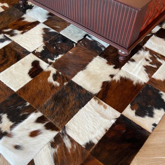 Luxury Tricolor Cowhide Patchwork Rug, Hair on Leather Rug, Natural Handmade Cow Skin Carpet Decor