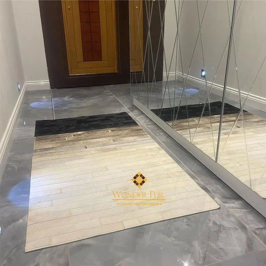 Tricolor Natural Cowhide Rug, Leather Cowhide Patchwork, Unique Entryway Rug