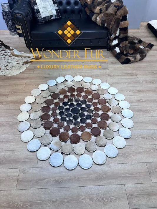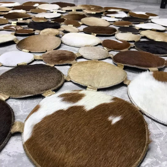 Tricolor Natural Leather Cowhide Patchwork Rug, Handmade Round Cow Skin Decor Rug