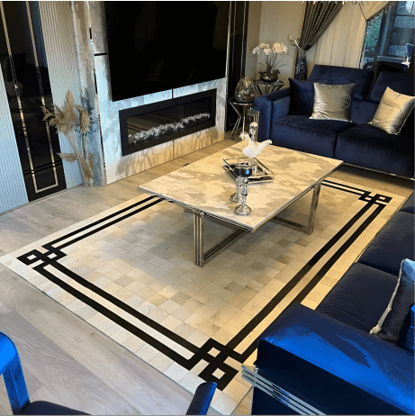 Luxury Black White Natural Sheepskin Area Rug, Gold Greek Key Handmade Rug