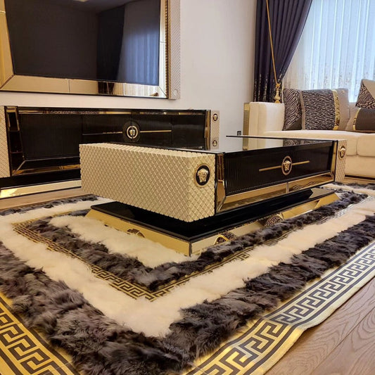 White Natural Handmade Sheepskin Rug with Double Gold Greek Key Pattern