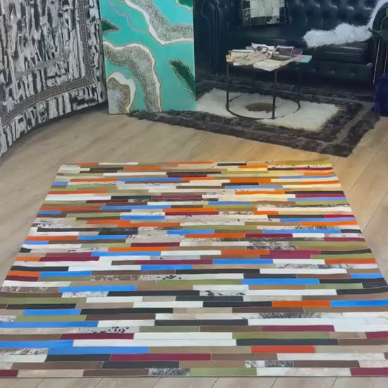 Colorful Natural Cowhide Patchwork Rug, Unique Multicolor Handmade Cow Skin Rug, Non Slip Rug