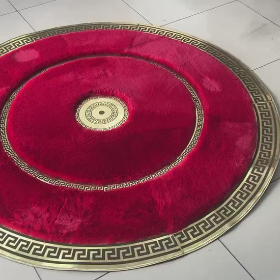 Elegant Gold and Red Faux fur Round Rug, Handmade Plush Area Rug