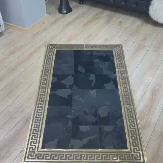 Gold and Black Luxury Natural Cowhide Rug with Greek Key Pattern, 100% Genuine Handmade Cowhide Rug
