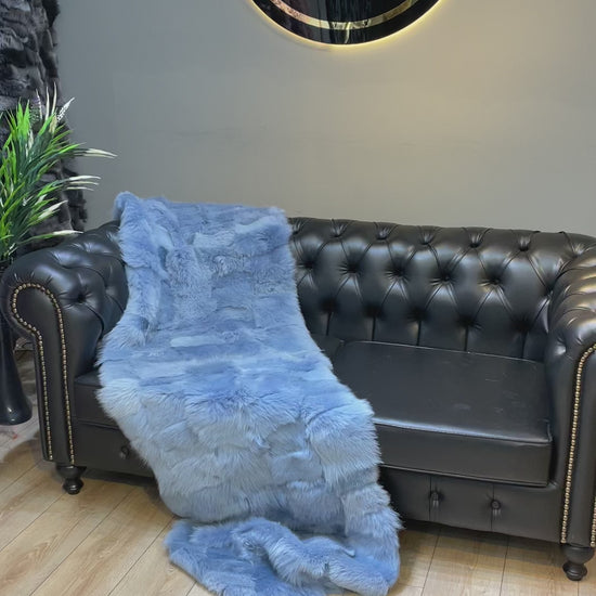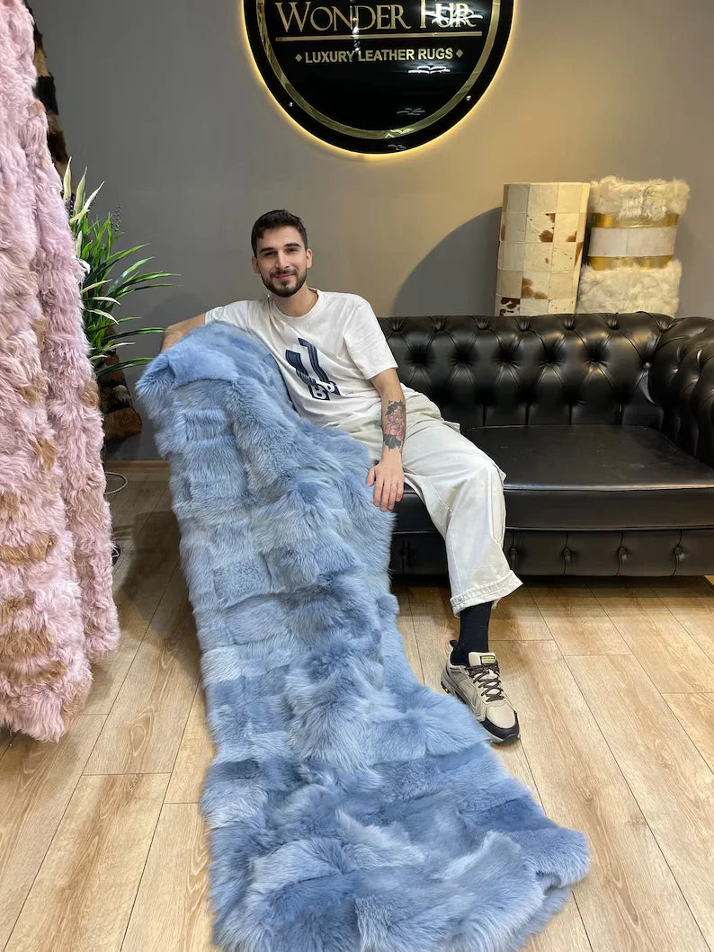 High Quality Natural Sheepskin Light Blue Throw Blanket, Cozy Handmade Blanket