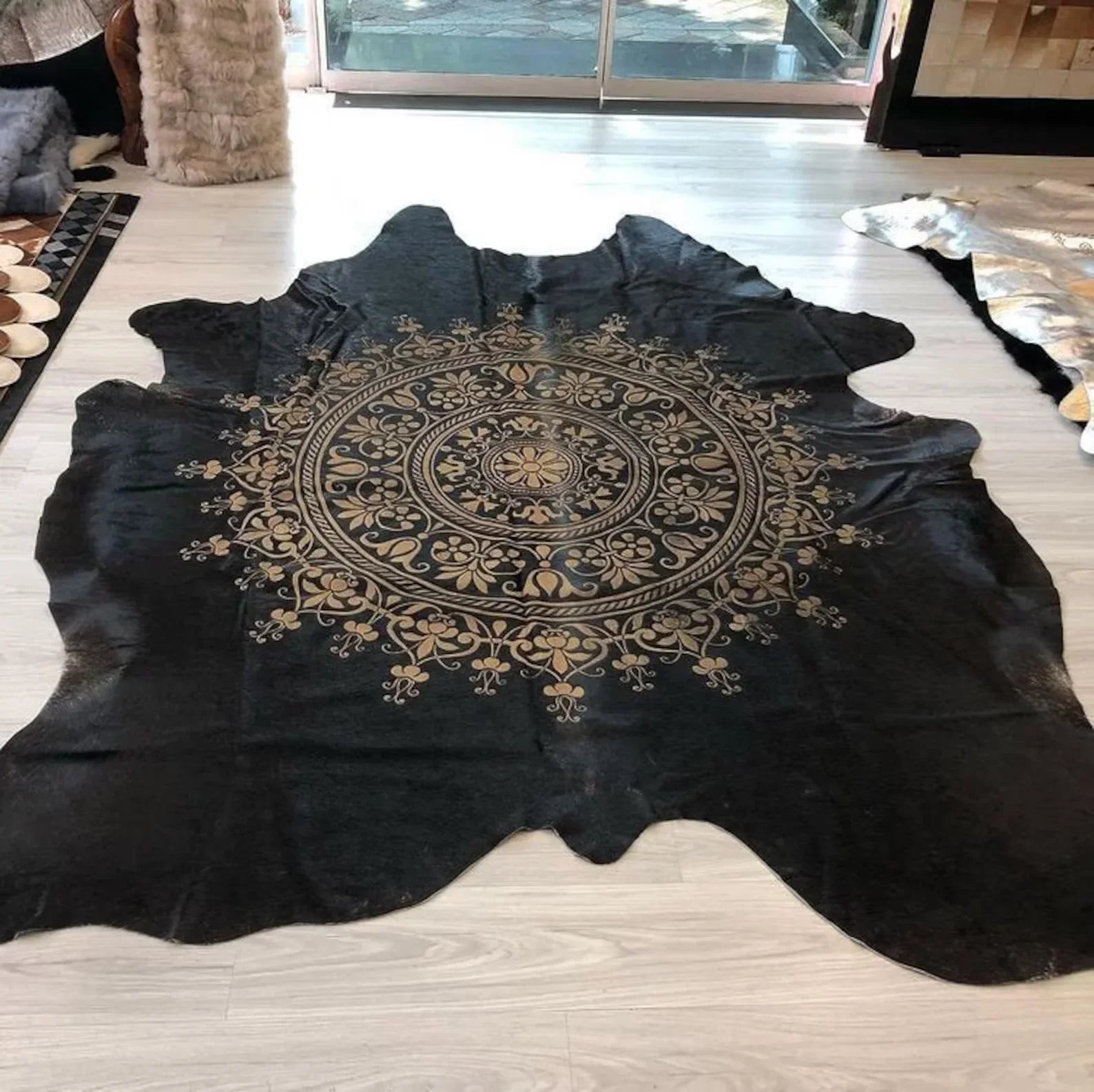 Laser Pattern Black Real Cowskin Decor Carpet, Natural Leather Handmade Rug