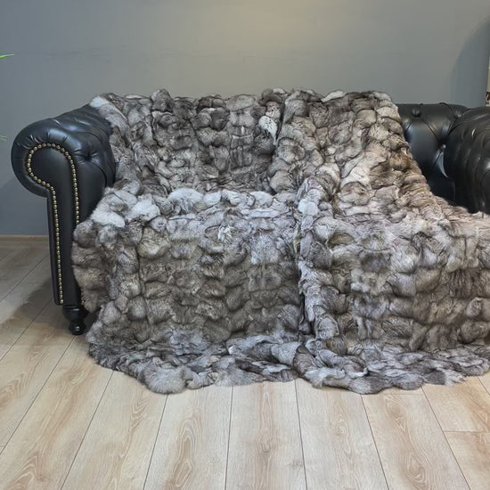 Luxury Ultra Soft Gray Natural Fox Fur Throw Blanket, Real Fur Handmade Blanket