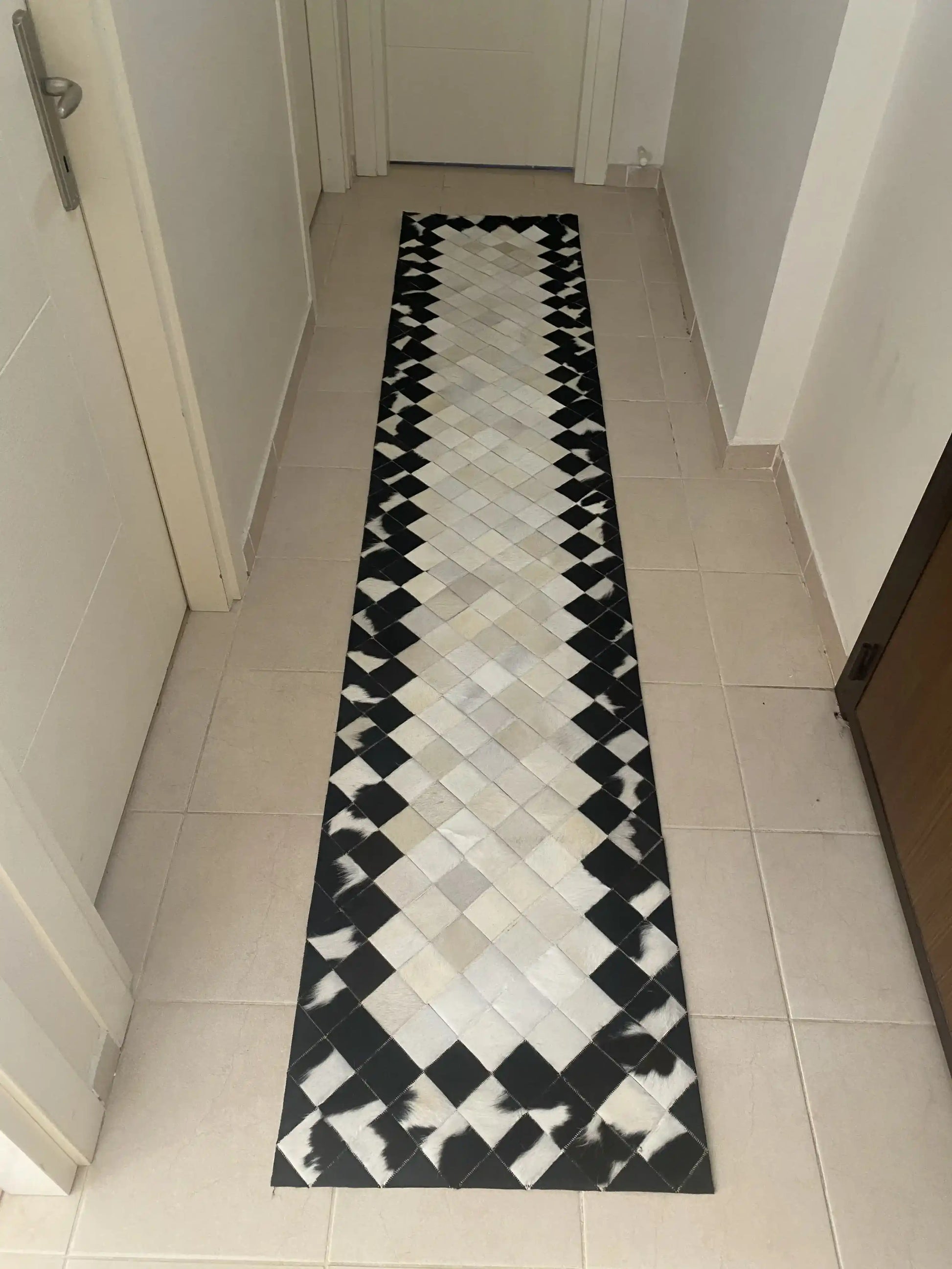 Unique Black and White Cowhide Runner Rug, Natural Leather Handmade Patchwork Rug, Cool Rug